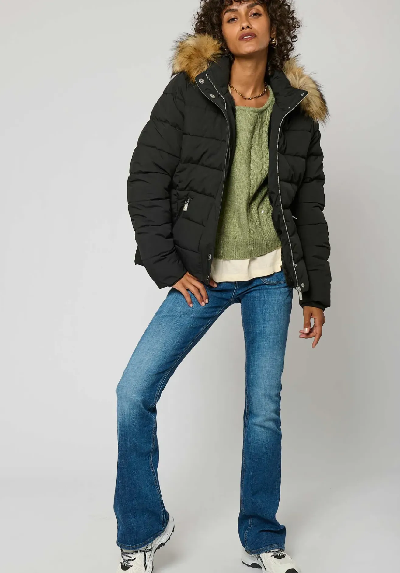 Capuche et imitation fourrure amovibles s’attachent à l’aide de boutons pression.