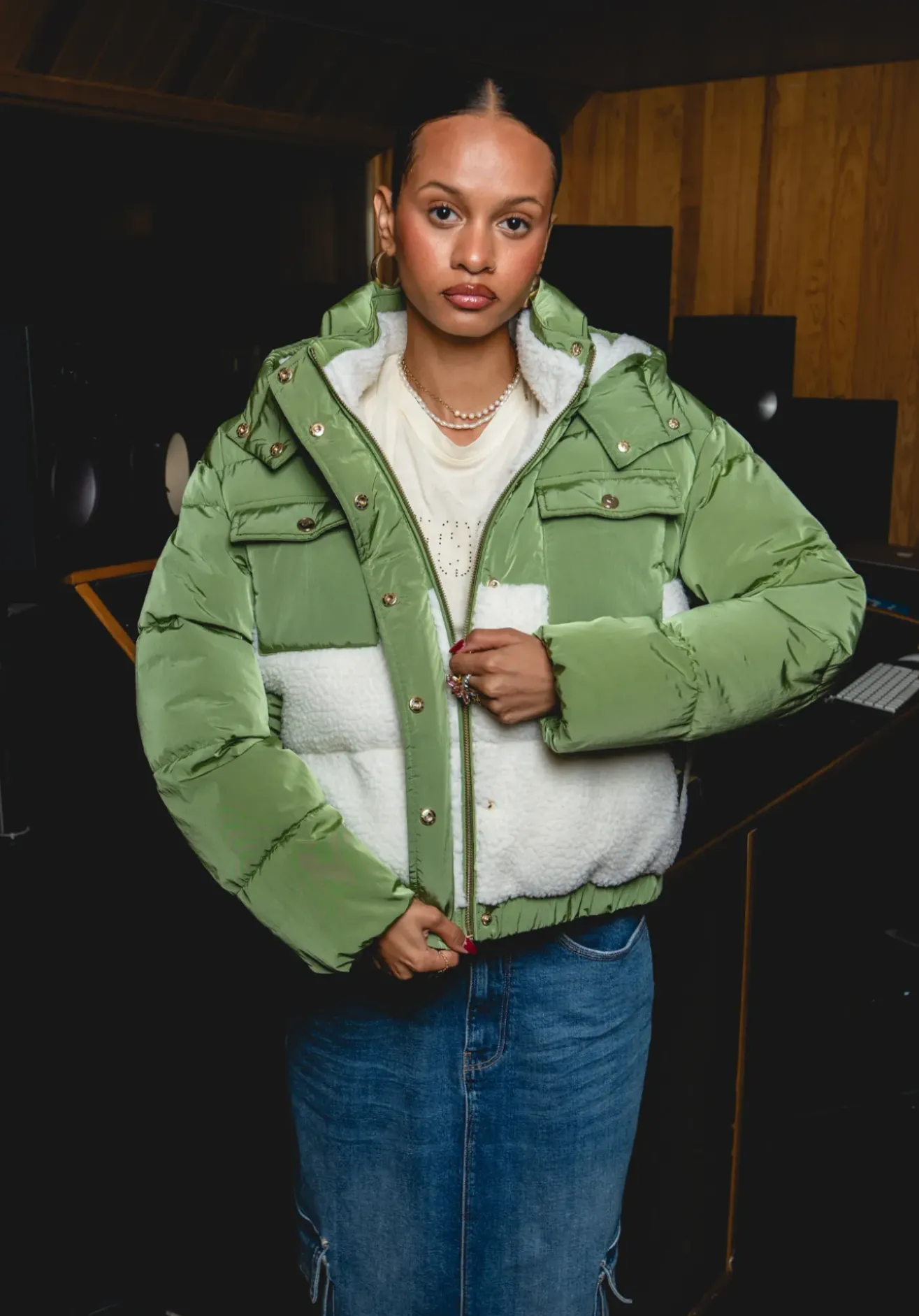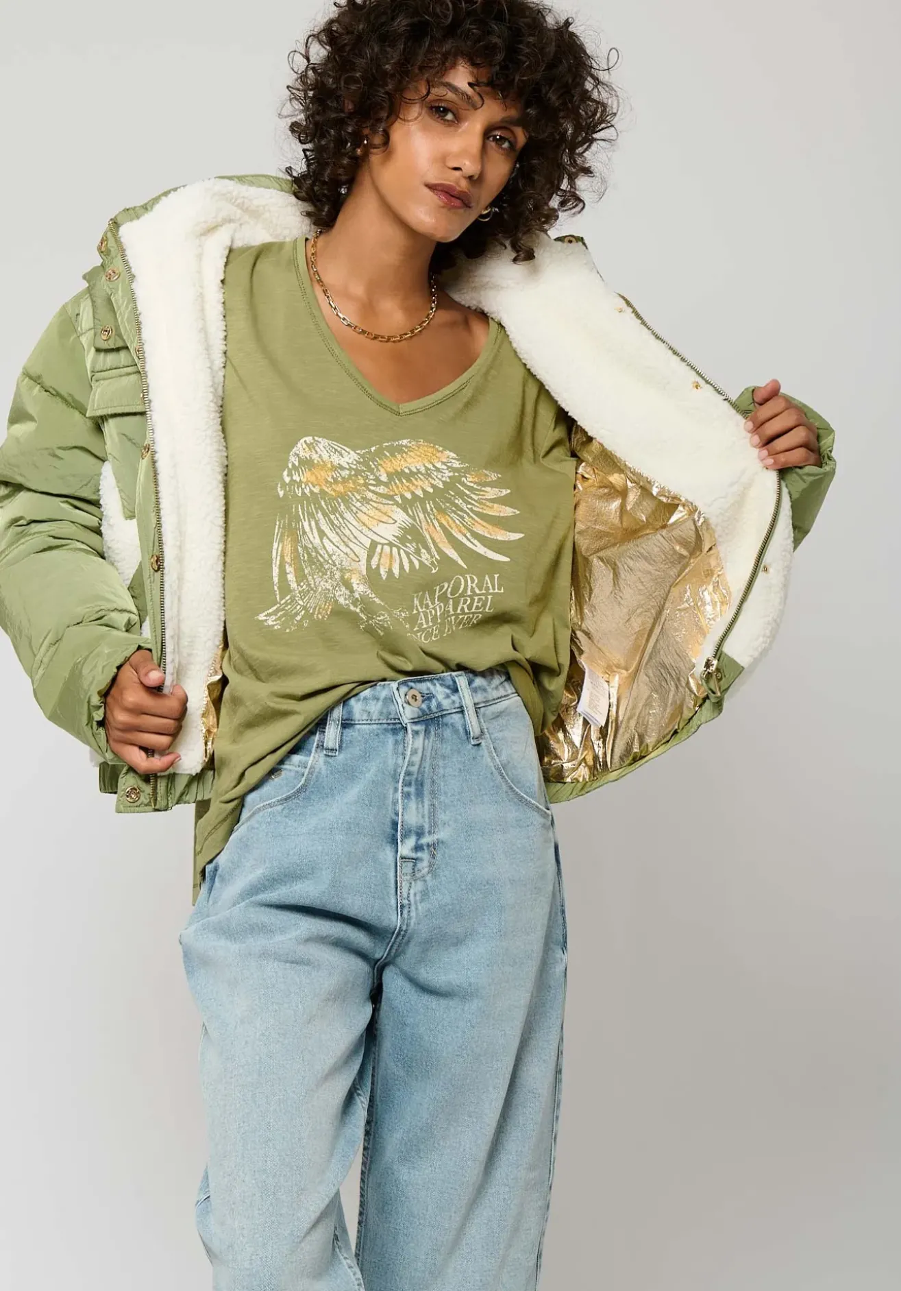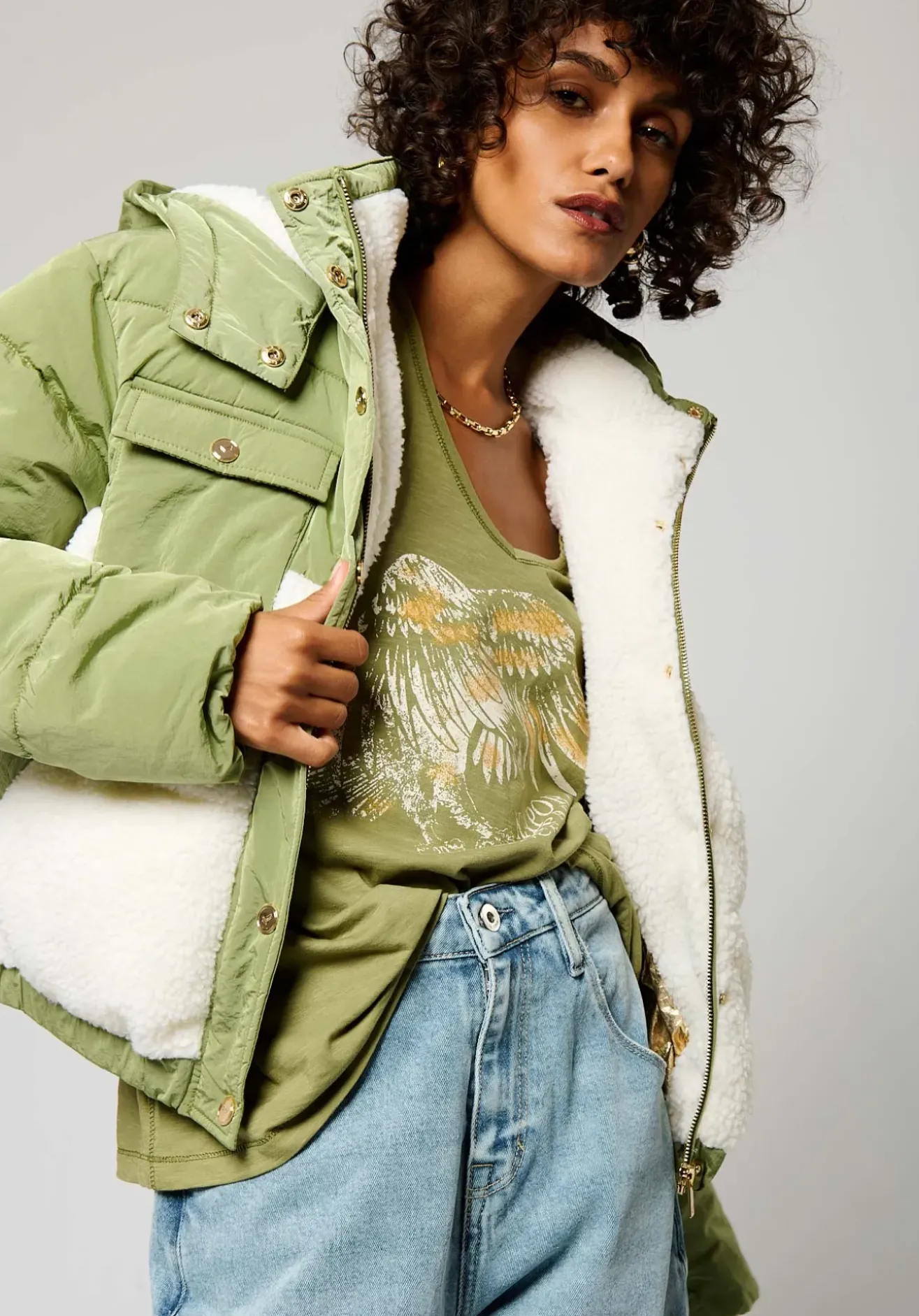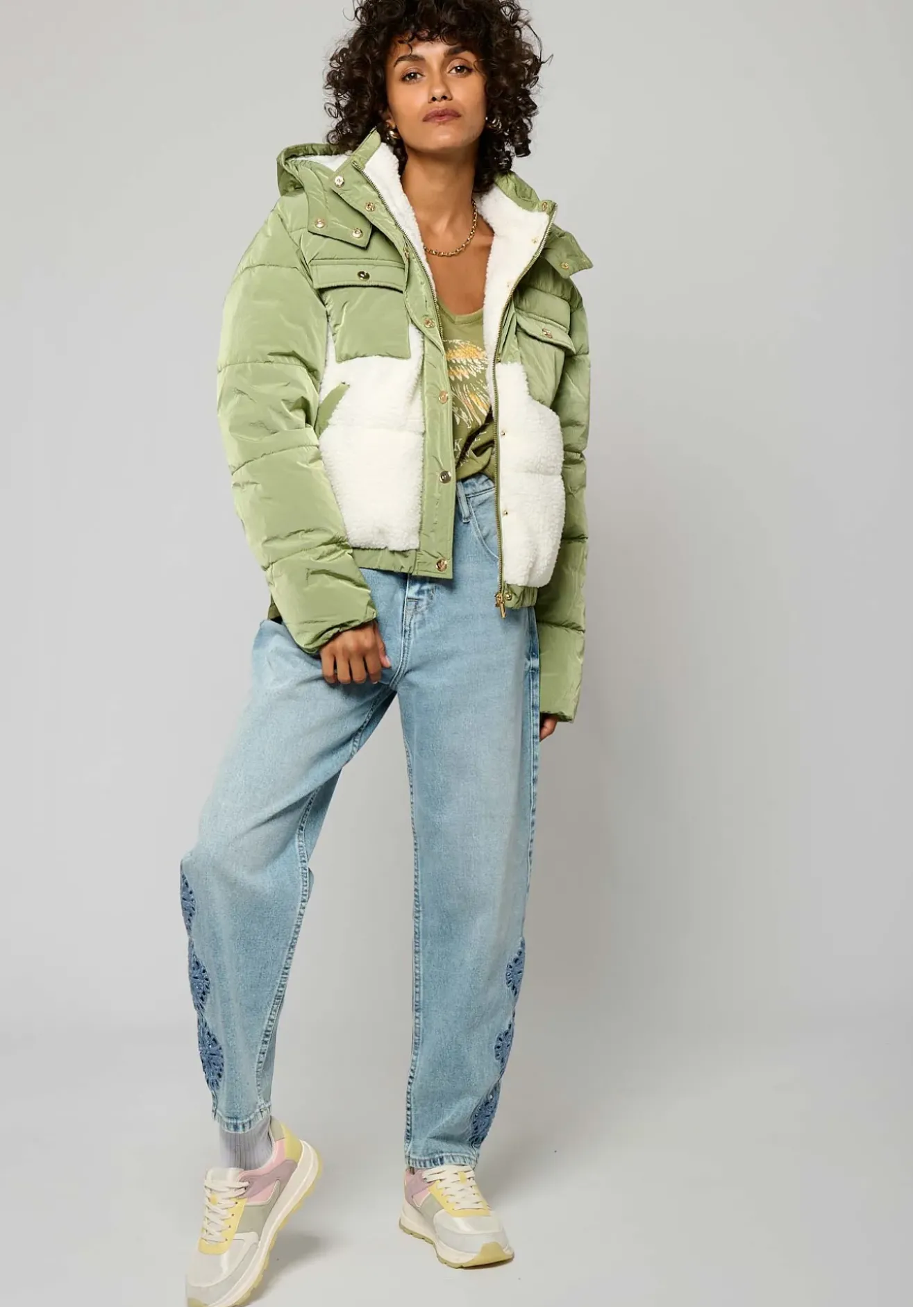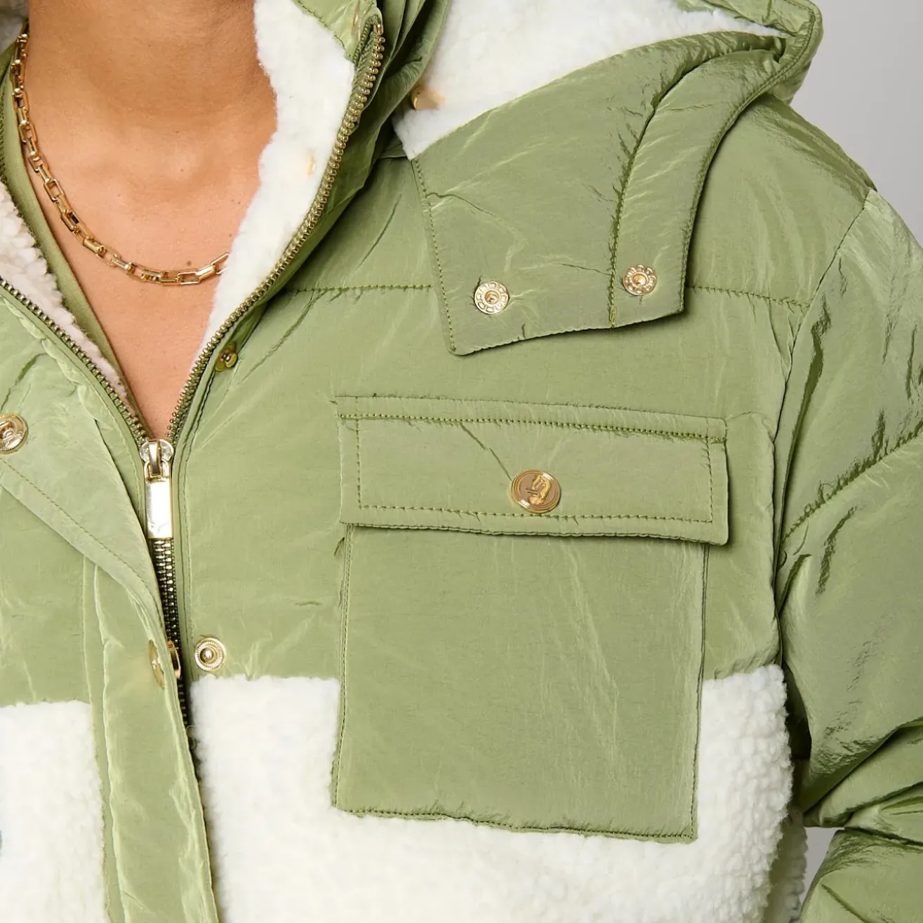 Capuche à imitation fourrure amovibles s’attachent à l’aide de boutons pression.
