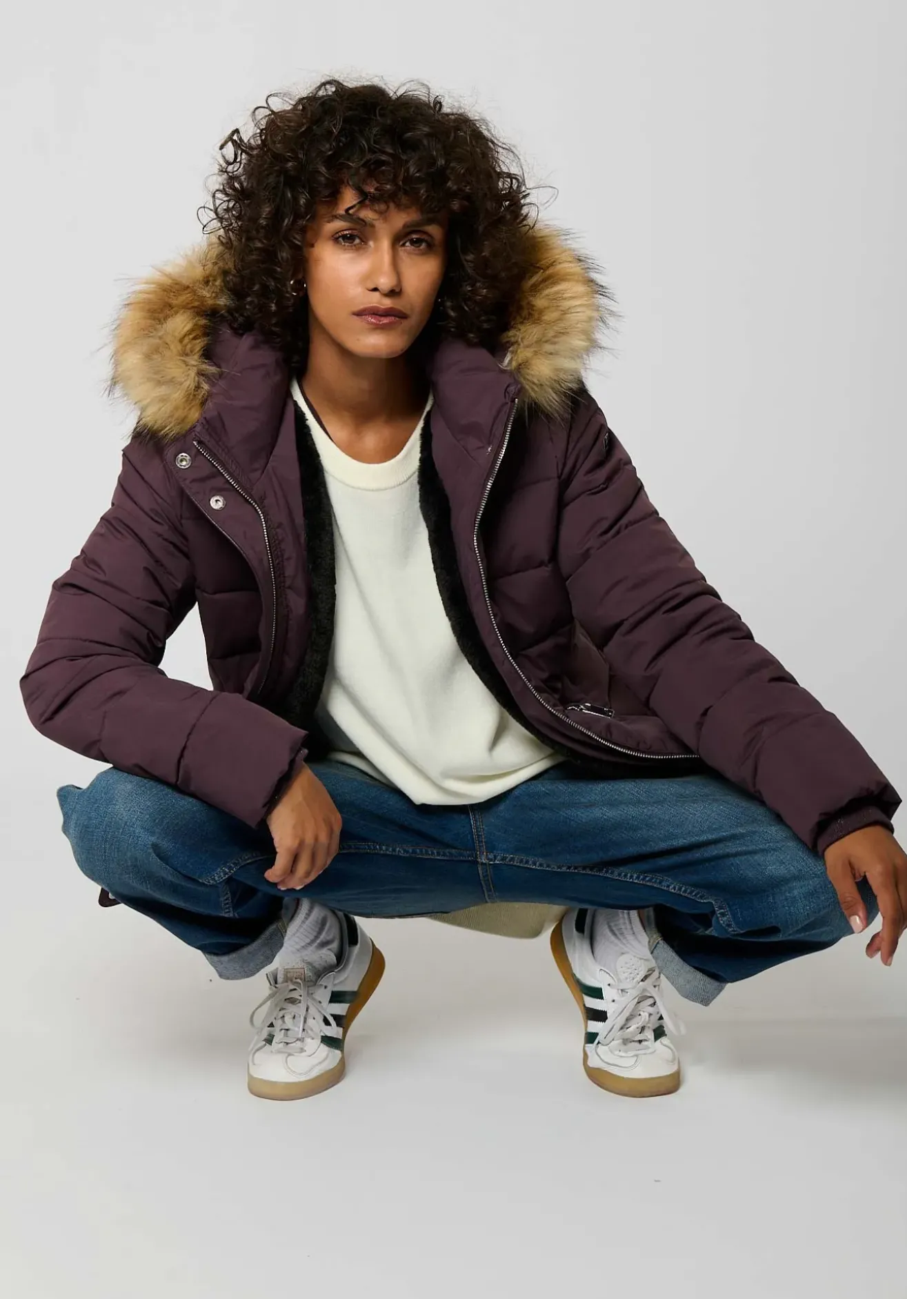 Capuche et imitation fourrure amovibles s’attachent à l’aide de boutons pression.